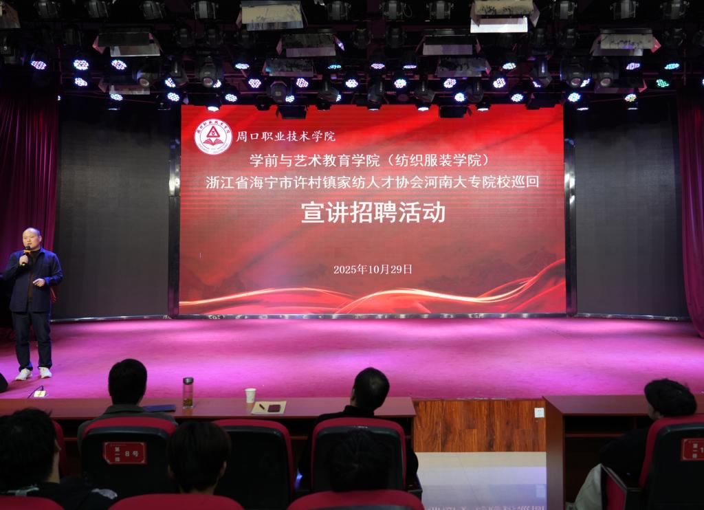 为精准对接高校人才培养与企业用人需求,助力学生高质量就业,10月29日下午,我院在艺术演播厅开展纺织服装专业企业宣讲会,浙江省海宁市许村镇家纺人才协会秘书长朱小平亲临现场进行宣讲。学院党总支书记王春生、副院长杨晨以及24、25级纺织服装专业学生共同参加活动。活动由院长高岐奎主持。
