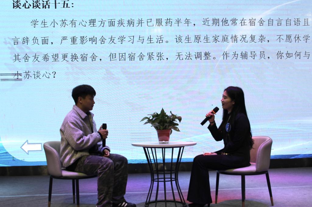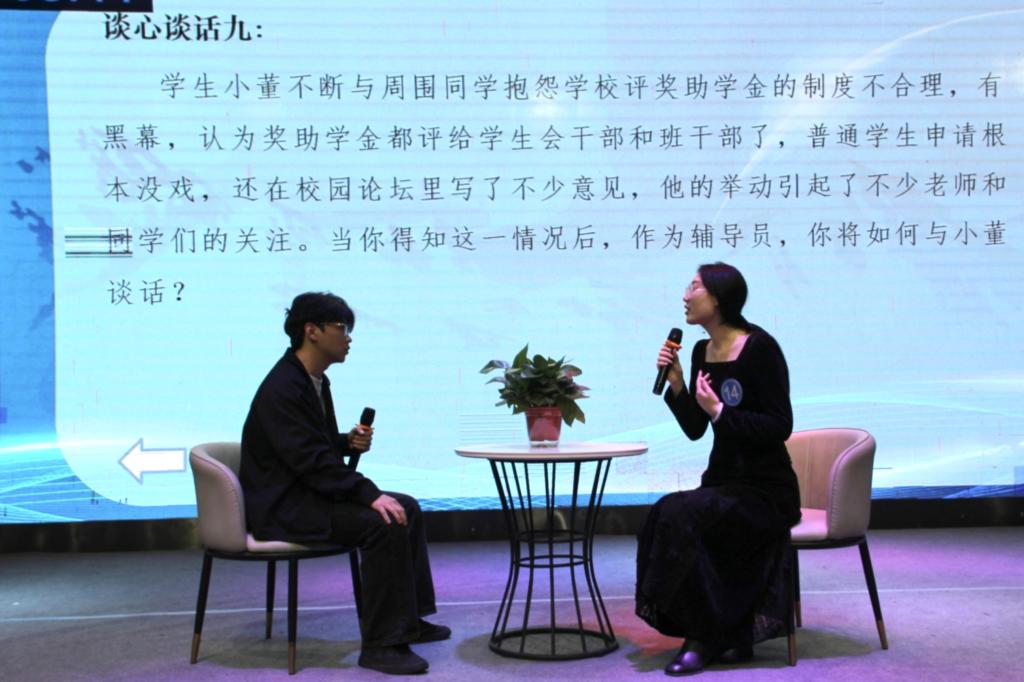 决赛设置案例研讨与谈心谈话两个环节,围绕学生管理、活动组织、沟通协调等核心能力,全方位考查辅导员的专业知识储备与职业素养。我院史宇可、王莹两位辅导员在比赛中发挥出色:案例研讨环节,她们分析精准透彻、对策务实,尽显扎实的理论功底与专业研判能力;谈心谈话环节,她们精准把握学生诉求,以共情引导与疏解帮扶相结合的方式高效回应问题,兼具人文关怀与方法创新,充分彰显出我院辅导员队伍过硬的专业素养与育人水平。
