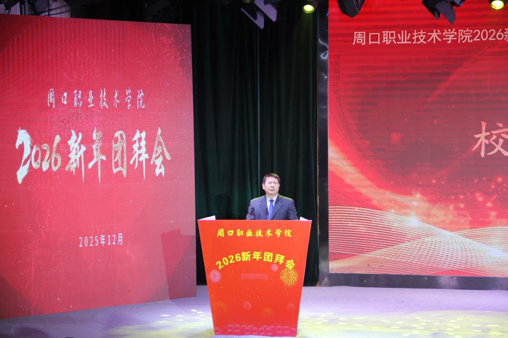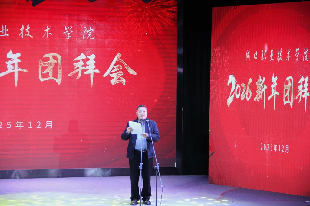 李清臣为团拜会致辞,向大家表示诚挚感谢与美好祝福。他回顾了2025年学校凝心聚力、攻坚克难的奋斗历程,全面总结了各项全年工作成效及各类荣誉斩获情况。他指出,2026年是“十五五”规划的开局之年,也是学校抢抓发展机遇的关键一年。面向新征程,学校将以“升本”为核心目标,持续深化“双高”建设,加快校区扩建进程,扎实完成办学能力评价任务,坚决筑牢校园安全防线,奋力书写学校高质量发展新篇章。